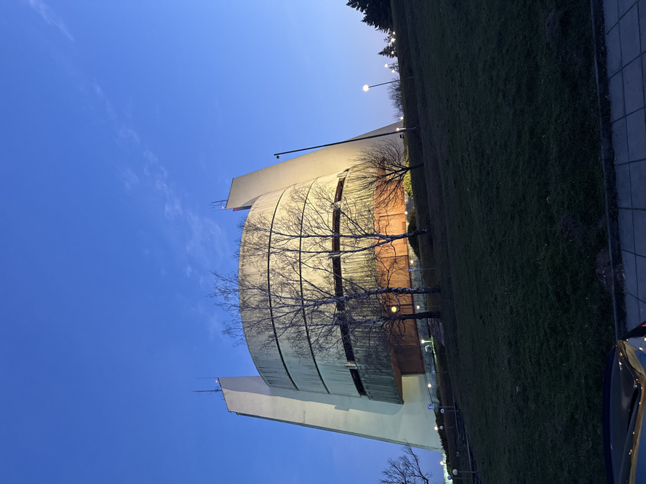The image displays the Panorama "Pleven Epopee 1877" monument, located in Pleven, Bulgaria, observed at dusk or early night. The central subject is a large, multi-tiered cylindrical building with a textured facade, illuminated by warm artificial lighting. It is adjoined on either side by two tall, slender, tapering rectangular towers, also lit, each surmounted by a thin antenna or lightning rod. In the midground, a dark green grassy slope ascends towards the monument. Several deciduous trees with bare branches are positioned on this slope, their silhouettes visible against the illuminated building. A winding path, demarcated by multiple spherical, globe-shaped lights, leads up the incline. A tall, dark lamppost stands vertically on the right side of the slope, distinct from the building. To the far right, a cluster of dark evergreen trees is visible against the horizon. The foreground consists of a dark paved surface, likely a sidewalk or road edge, with the dark, reflective hood of a vehicle partially visible in the bottom left corner. The sky is a deep, clear blue, indicative of twilight or early evening, with minimal cloud cover. No individuals are present within the frame.