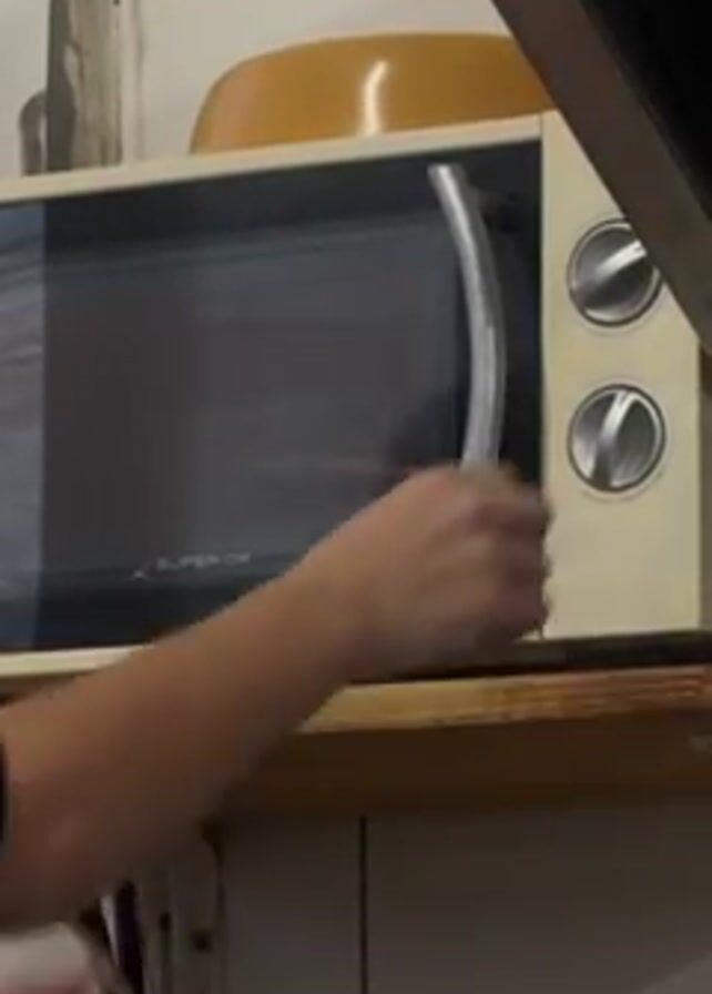 A person opens a microwave with two dials on the right side and a silver handle, removes a white-and-silver wicker basket from the interior, and pulls it out. The microwave is old and sits on a wooden shelf over white cabinets. There is an orange bowl on top of the microwave.