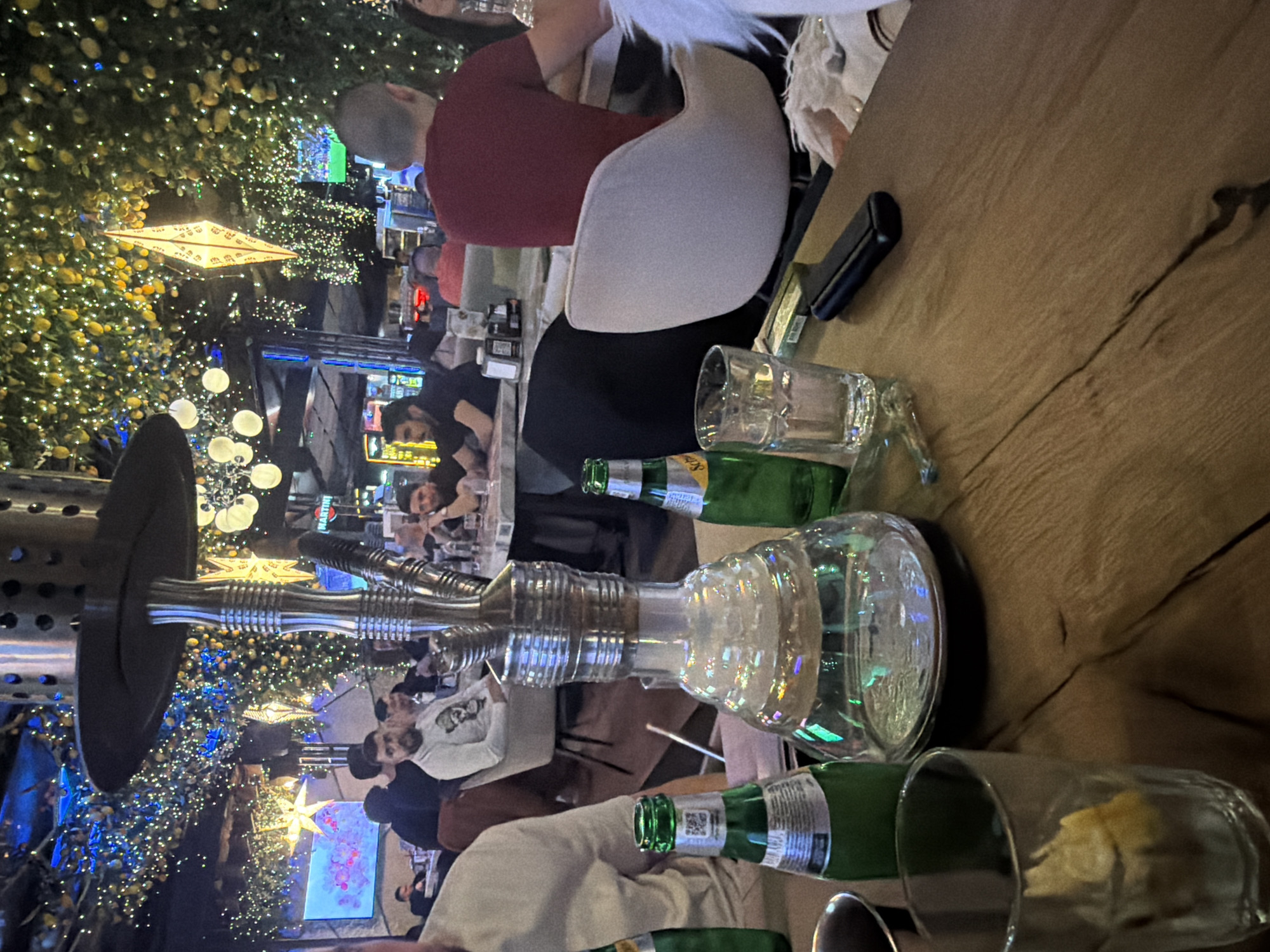 The scene appears to be set in an outdoor restaurant or bar in Sofia, Bulgaria, judging by the architecture and festive lighting. Patrons are seated at tables, and a hookah is prominently displayed in the foreground. Multiple bottles of Schweppes are scattered on the table, along with empty glasses. The atmosphere is lively with people engaging in conversations and enjoying the evening, amidst a backdrop of illuminated trees and stars.