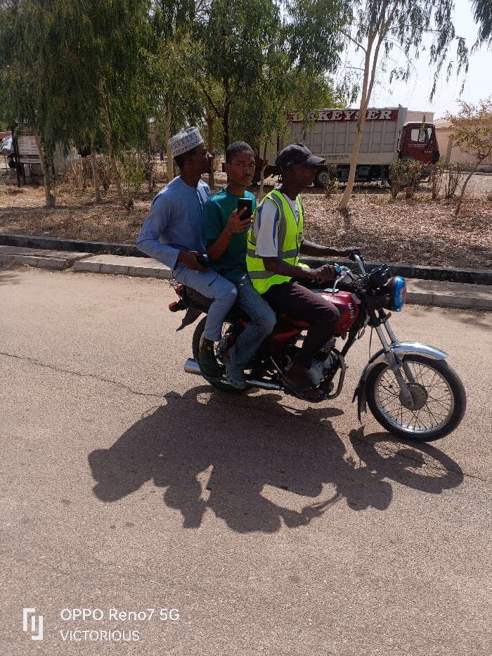 Three male individuals are observed riding a red motorcycle on an asphalt road under bright daylight, casting distinct shadows. The scene is situated within the vicinity of Federal University Dutse, Dutse, Nigeria, indicated by a large, light-colored box truck in the background bearing partially visible text, including "C. KEYSER UNIVERSITY P.L.T.Y". The motorcycle operator, positioned at the front, wears a black baseball cap, a neon yellow reflective safety vest over a white shirt, and dark pants. His hands are on the handlebars. Immediately behind him, the middle passenger wears a dark green t-shirt and light blue jeans, holding a black smartphone vertically in his right hand. He is looking towards the viewer's right. The third individual, seated at the rear, wears a light blue long-sleeved traditional garment, light pants, and a patterned skullcap, looking to his left. The motorcycle itself is red with silver accents on the front fender and exhaust pipe, featuring a blue-tinted headlight. The background comprises dry earth with sparse vegetation and numerous trees with light green foliage. Beyond the trees, the aforementioned truck, a red truck cab, and a light-colored building are visible. The asphalt road surface shows minor cracks.