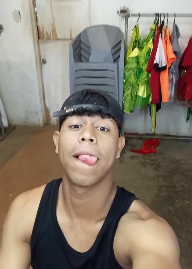 A man wearing a black tank top and a black baseball cap is looking at the camera. The brim of the cap is facing backwards. He is in a room with white walls. There is a white door behind him to the left, and a metal rack holding clothing items to the right. The clothing is mostly colorful, including green, yellow, orange, and red. There are some masks and wall hangings above the rack of clothing. He first waves, then sticks out his tongue, and then makes a kissing face.