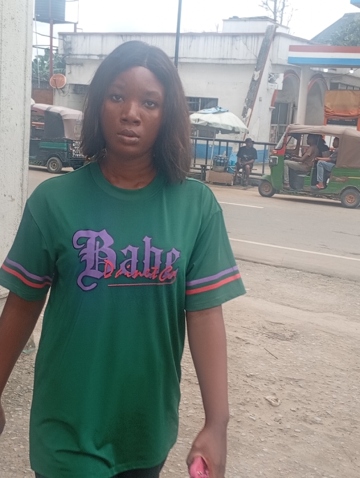 The image depicts a street scene in the city of Aba, Abia State, Nigeria, under an overcast sky. In the foreground, a Black female, approximately 20-30 years old, with shoulder-length dark hair, faces the camera with a neutral expression. She wears a dark green short-sleeved t-shirt with "Babe" in purple Gothic script and "Planet Co." in smaller red script on the chest; the sleeves feature horizontal purple and red stripes. Her left hand holds a pink object. To the subject's right and in the midground, a paved road traverses the scene. A green and black motorized trishaw (Keke Napep) with at least two Black male occupants, one driving and one passenger, is positioned on the road, moving towards the right. Further back on the left side of the road, another green and black trishaw is parked. On the right side of the road, adjacent to a building, a vendor's setup is visible, consisting of a white umbrella, likely bottles of water, and a Black male seated on a low stool. The background is dominated by a two-story white building with multiple windows. On the right side of this building, a structure consistent with a petrol station, featuring blue and red striped pillars, is partially visible. Above the building on the far left, a black water tank is mounted on a raised structure, and a large, rusty satellite dish is attached to a pole. The ground in the immediate foreground is rough, appearing to be dirt or weathered concrete.