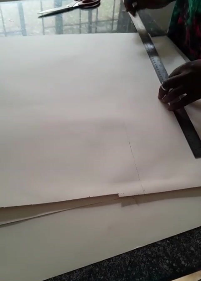 A person is seen drawing a line with a pencil and a metal ruler on a large sheet of white paper. The paper is on top of a dark gray, possibly granite countertop, which has a hint of wood underneath. Scissors and another ruler are also on the countertop, to the left of the paper. The person is wearing a shirt with a multicolored, floral pattern. The room seems to be well-lit with natural light coming from a window.