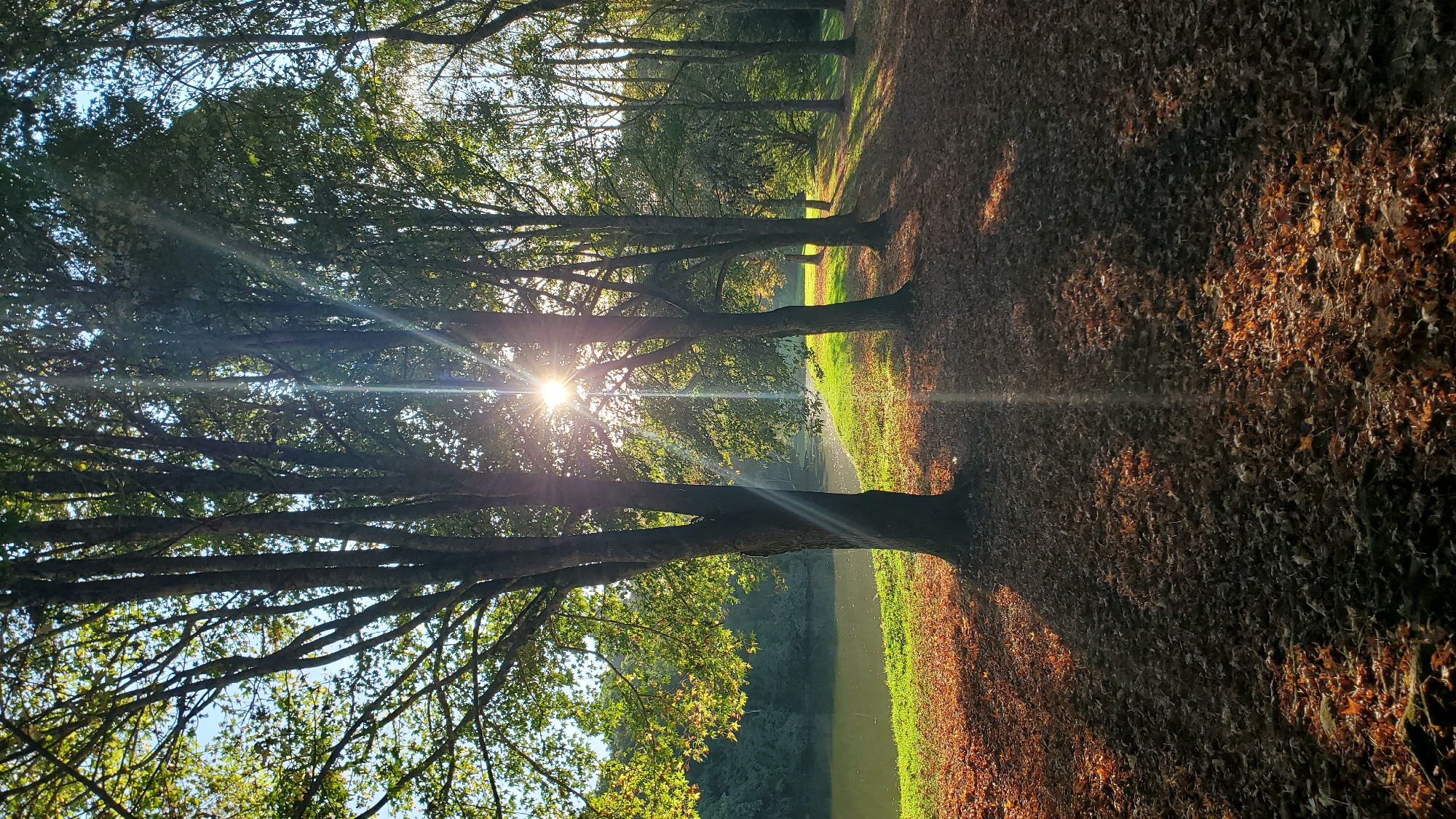 This image captures a wooded landscape in Curitiba, Brazil, during a low-sun period, likely morning or late afternoon. A prominent sunburst emanates from the upper-middle right, piercing through the canopy of several deciduous trees with dark, vertical trunks and mostly green foliage. These trees are arranged in a line, casting long, defined shadows onto the ground, which is extensively covered in an uneven layer of dry, reddish-brown fallen leaves. To the left, a calm body of dark water, likely a lake or river, extends horizontally, reflecting the surrounding light. The immediate bank of this water body features a narrow strip of vibrant green grass before transitioning into the leaf-strewn ground. The distant shore across the water is densely covered in trees and foliage. The sky is visible as patches of clear blue through the upper tree branches. There are no individuals, structures, or animals visible within the frame.