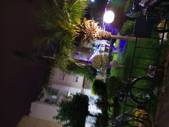 A nocturnal scene depicts a palm tree adjacent to a building, illuminated by a street lamp. The foreground features a metal fence, with a bicycle leaning against it. Manicured shrubs dot the grassy area. Festive blue lights and decorations add to the ambiance. The sky is a solid dark color.