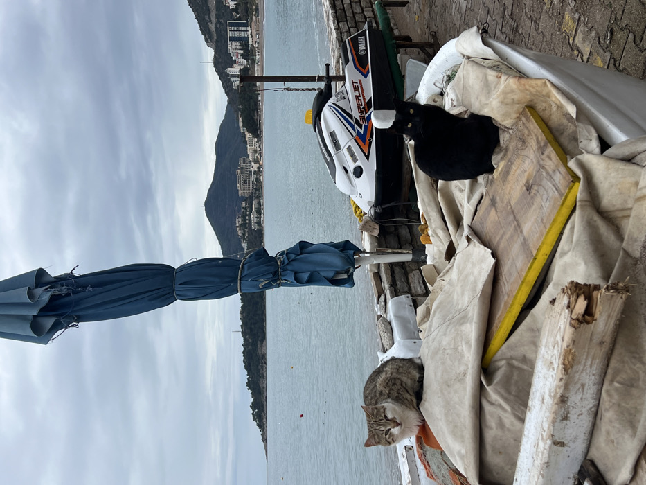 The image depicts a coastal scene in Rafailovići, Montenegro, on a cloudy day. In the foreground, a light-colored boat, possibly fiberglass, contains various materials including light-colored fabric or canvas, a piece of yellow-edged wooden board, and splintered wooden planks. Two domestic cats are present within or adjacent to the boat's contents. A tabby-patterned cat, primarily grey, brown, and white, sits on a raised white surface on the left side, facing slightly right with its eyes partially closed. A solid black cat sits upright within the boat's interior on the right, facing forward with its yellow eyes open. Behind the boat, a collapsed and tied-up blue beach umbrella is centrally positioned. To its right, partially obscured by a support post, is a white and blue Yamaha SuperJet personal watercraft (jet ski) resting on a green support structure, facing left towards the water. A low stone wall runs horizontally across the midground, separating the immediate foreground from the sea. The calm, light blue-green sea extends across the midground and into the distance, with a few red and yellow buoys visible. On the distant coastline, multiple buildings, including multi-story structures, are visible along the shore, backed by green, tree-covered hills and mountains under an overcast sky. The overall impression is one of a coastal area, possibly during an off-season or a quiet period.