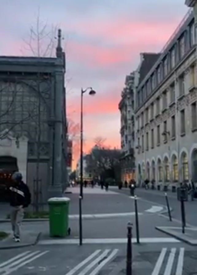 street scene in Paris, France at dusk. The sky is a mix of pink, orange, and blue. There are several buildings lining the street, including a large grey building on the left and a tan building with arched windows on the right. A person wearing a black jacket and helmet is walking on the sidewalk to the left. A green trash can is visible beside them. There is a crosswalk on the street with white stripes. Other people can be seen walking further down the street.