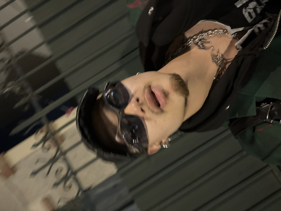 A head-and-chest level image depicts a single male individual. The subject is characterized by a light mustache and goatee, wearing dark, wrap-around sunglasses and a dark cap. Multiple silver hoop earrings are visible on his left ear. He is dressed in a dark green outer layer over a black hooded garment, featuring a prominent silver chain necklace with an intricate, stylized pendant. A black strap, consistent with a bag, is visible over his right shoulder. The subject's mouth is slightly open, and he is looking directly forward. The background is blurred, showing dark vertical elements and faint decorative metallic scrollwork, suggestive of a fence or railing. The lighting appears artificial or low-light. The scene is situated in the city of Asnières-sur-Seine, France.