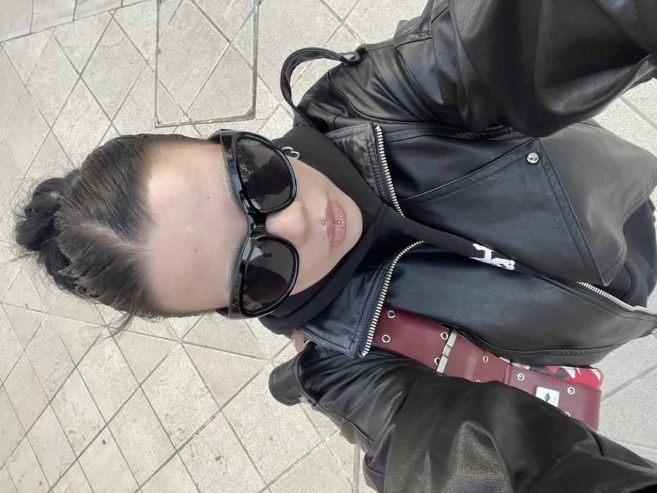 A high-angle selfie photograph depicts an individual outdoors on a paved surface in Mostar, Bosnia and Herzegovina. The subject, positioned centrally within the frame, has dark hair pulled into a high bun and wears dark, thick-framed, oval sunglasses. Their eyebrows appear light-colored, possibly with a subtle green or blue tint. A silver stud is visible in a philtrum piercing located above the upper lip. The individual is dressed in a black leather biker-style jacket with a zippered front and wide lapels, layered over a black hooded sweatshirt. A dark red shoulder bag, featuring silver eyelets and buckle-like hardware, is visible over the subject's left shoulder. A small silver heart-shaped earring or ear cuff is discernible on the right earlobe. The background consists of light-colored, rectangular pavement tiles arranged in a grid pattern. A metal utility cover or grate is visible on the tiled ground to the right of the subject. No other individuals or distinguishing architectural landmarks are present in the visible environment.