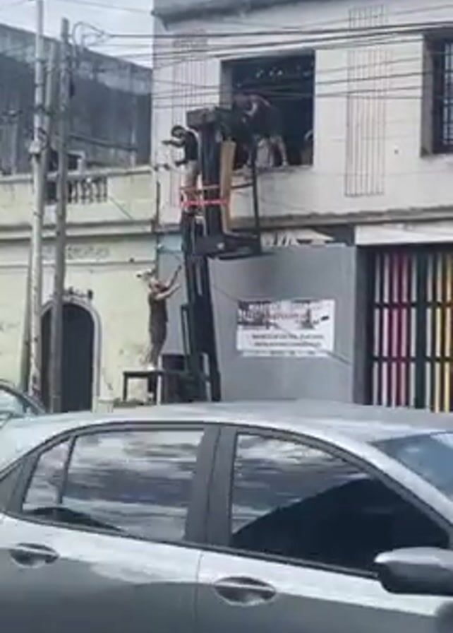 street scene where several individuals are working on the upper level of a two-story building, accessed by a forklift modified for lifting people