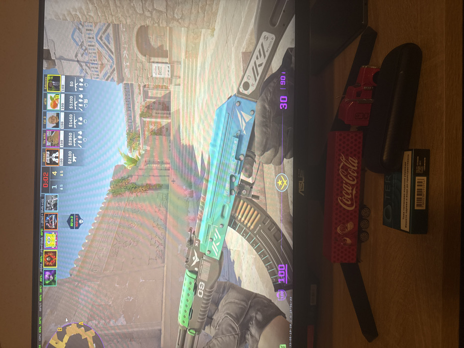 An overhead photograph captures a gaming setup in an indoor location in Plovdiv, Bulgaria. The central focus is a computer monitor displaying a first-person perspective from the video game Counter-Strike, featuring an AK-47 assault rifle with a distinct teal, blue, and black "Neo-Noir" skin, held by a gloved hand. The game's environment depicts an ancient-themed map with stone structures, walls, and sparse vegetation, possibly "Ancient." The monitor's top left corner shows system performance metrics including CPU and GPU temperatures (63°C CPU, 52°C GPU), while the top right displays the game score (1-4), a round timer (0:02), and player avatars with associated in-game cash amounts. The bottom of the screen shows the player's health (100) and ammunition count (30/90). Below the monitor, resting on a wooden desk surface, are three distinct objects. To the left is a red model semi-trailer truck. The trailer portion is emblazoned with the white "Coca-Cola" logo against a red background featuring a repeating pattern of smaller Coca-Cola symbols. The red truck cab is separate from the trailer. Adjacent to the truck, on the right, is a black, elongated, oval-shaped charging case or holder for a heated tobacco or vaping device. Positioned in front of the black case is a small, rectangular blue and white box labeled "TER." Cyrillic text on the box, partially visible, includes phrases indicating it is a product containing liquid, intended for adult use, and not harmless. A barcode is also visible on this box. The base of a black ASUS monitor stand is visible beneath the monitor, supporting the display.