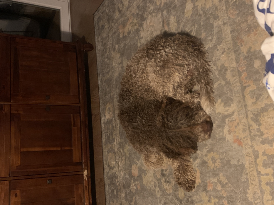 The scene depicts an indoor domestic environment located in Budva, Montenegro. A single medium-sized dog with curly, bi-colored fur, transitioning from dark brown on its head and upper back to lighter tan/cream on its lower body and hindquarters, is the central subject. The dog is observed lying curled on a patterned rug, appearing to be asleep or resting. Its head is tucked forward, resting on the rug, with its nose pointed towards the bottom center of the frame. The rug displays a faded, abstract pattern in tones of grey, cream, and subtle orange/yellow. In the background, a dark wooden cabinet or credenza with multiple panel doors extends across the upper half of the frame, exhibiting a reddish-brown finish and minor wear along its base. To the far right, a partial view of a white door frame or window frame with a reflective glass panel is visible. No human subjects are present. The ambient lighting suggests an indoor setting with no direct natural light source evident.