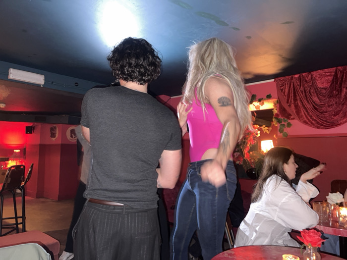 The image depicts an interior scene within a dimly lit establishment in Unknown, Unknown, consistent with a bar or lounge. The venue features red walls, a dark ceiling with a prominent bright white light source, and red ambient lighting from various fixtures, including a red-shaded lamp on the left wall. In the foreground, the back of a person with dark, curly hair is visible, wearing a dark grey ribbed t-shirt and dark pinstripe trousers with a brown belt. To their right, a person with long blonde hair, wearing a bright pink sleeveless top and blue jeans, is in a dynamic pose, partially turned away from the camera. A tattoo depicting a shell or fan is present on their right upper arm. Further right, a woman with brown hair, dressed in a white long-sleeved shirt, is seated at a round red table adorned with glasses, lit candles, and a single red rose in a small vase. The background includes red velvet drapes on the right, a decorative mirror or framed opening embellished with green foliage and red flowers, and indistinct figures suggesting additional patrons. A white air conditioning unit is mounted on the upper left wall.