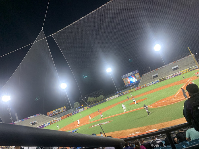 A baseball game at night. Bright stadium lights illuminate the green field. Players in white and black uniforms are scattered on the field. A large scoreboard displays action footage. Banners with the words "APUESTAS ROYAL.COM" are visible along the upper levels. A net hangs overhead, and rows of spectators fill the stands.