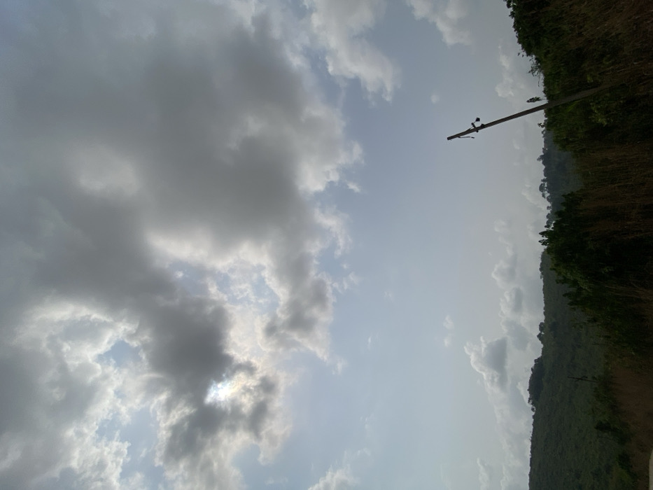 The image depicts an outdoor landscape in Unwana, Nigeria, under a partly cloudy sky. The upper two-thirds of the frame are filled with a pale blue sky featuring numerous large, grey cumulus clouds, with a bright, sun-obscured area visible in the upper left. The lower third shows a natural environment. In the immediate foreground on the right, tall, dry, light brown grasses are present, interspersed with darker green foliage. A single, dark utility pole, possibly concrete or wood, stands leaning slightly towards the left in the mid-ground on the right side, equipped with insulators near its apex. The background consists of a continuous, undulating horizon line of densely forested hills or mountains covered in various shades of green vegetation. No people, discernible actions, or interactions are visible.