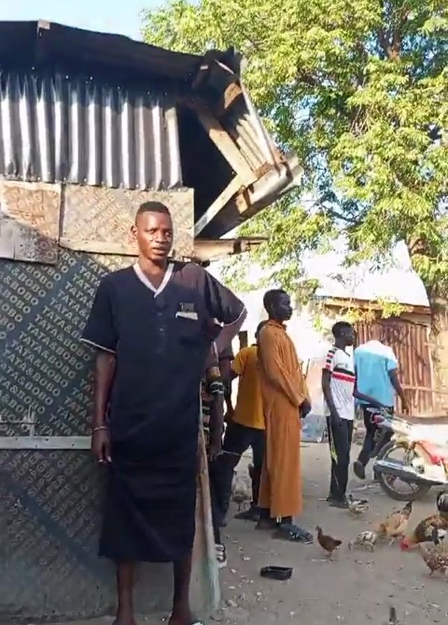 man in a black robe standing in front of a small structure made of corrugated metal and plywood. The plywood has a repetitive logo printed on it. Several other men are standing in the background. There is a parked motorcycle and several chickens scattered around the ground. A large tree is visible behind the group of men. The overall setting appears to be an outdoor area, possibly a village or residential neighborhood.