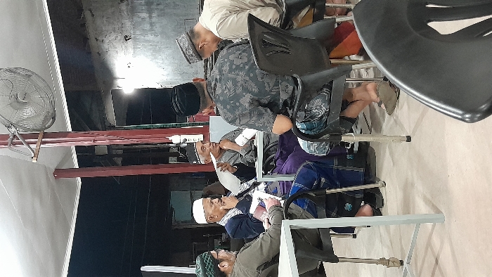 The image depicts a nighttime gathering of five adult males within a covered, semi-outdoor space in Lhokseumawe, Indonesia. The area features a white canopy ceiling supported by red metal beams, and a wall-mounted industrial fan is visible in the upper right. The floor is light-colored. Five males are seated around two light-colored rectangular tables. From left, an individual wearing a green skullcap, dark long-sleeved shirt, and eyeglasses holds a white document. Next to him, an elderly male in a white skullcap, dark jacket, and blue sarong holds his right hand near his chin, appearing contemplative. To his right, an elderly male wearing a patterned dark skullcap, light shirt, and purple sarong gestures with a white paper. Directly across from him, with his back partially to the viewer, is a male wearing a black skullcap, a dark patterned short-sleeved shirt, and patterned shorts, with flip-flops on his feet. A fifth male, wearing a light patterned skullcap and light shirt, is partially visible on the far right. The individuals appear engaged in conversation or a meeting.