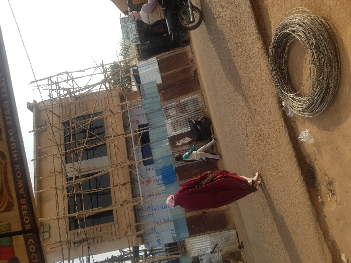 A building under construction has bamboo scaffolding. Metal sheets line the facade. On the roadside, a coil of wire rests beside people lying on the ground and walking by. A partially visible shop sign and a person on a motorbike are nearby. The image is captured in daylight, showing a bustling street scene.