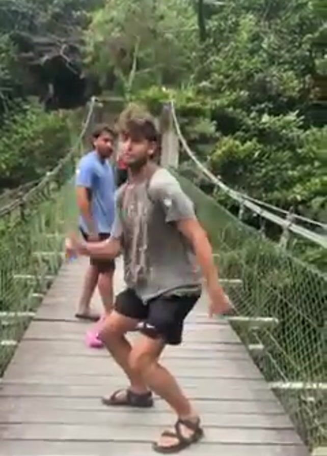 Two men are on a wooden bridge over a waterfall. The bridge has rope railings. The man closest to the camera is wearing a gray patterned t-shirt, black shorts, and sandals. He jumps and poses for the camera. The second man is wearing a blue t-shirt, black shorts, and flip-flops. He stands near a pink object on the bridge. The camera pans from the men to the waterfall. The waterfall is surrounded by lush green vegetation.