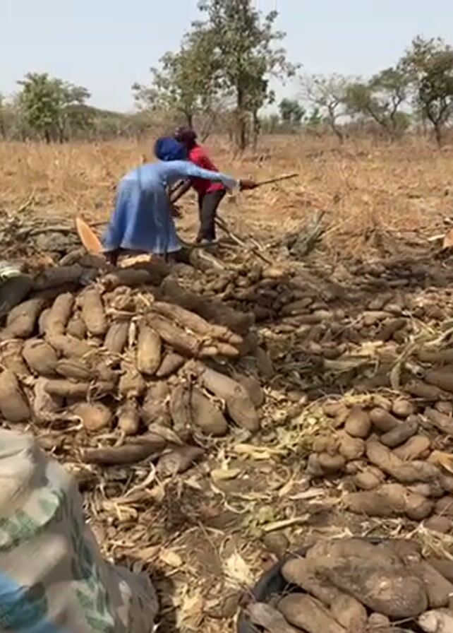 Two people are working in a field, possibly harvesting yams