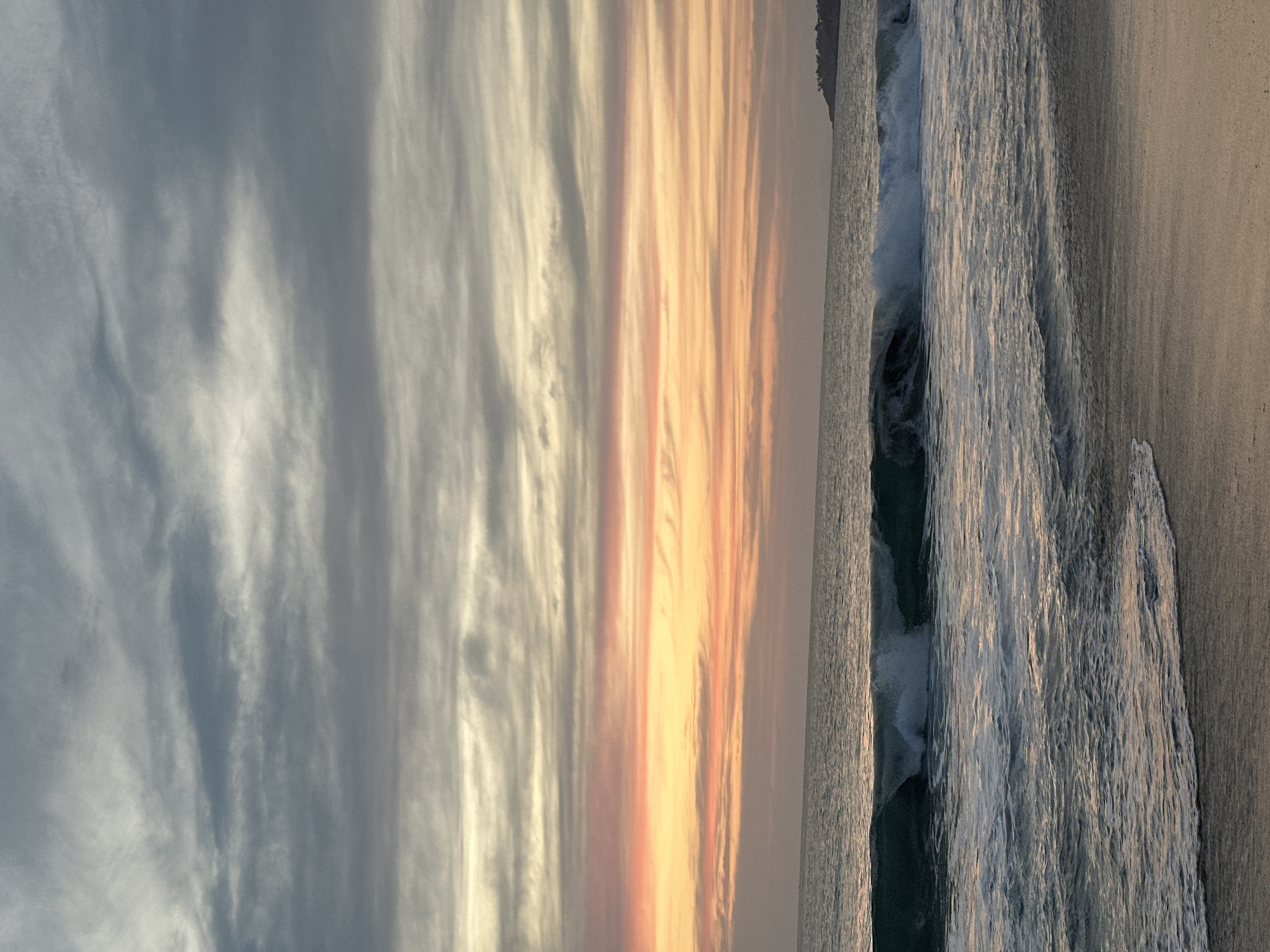 The image depicts a beach scene at Brisas de Zicatela, Mexico. The ocean waves are breaking on the shore. The sky above exhibits a dramatic sunset with streaks of grey, white, orange, and yellow clouds. The photo orientation is vertical.