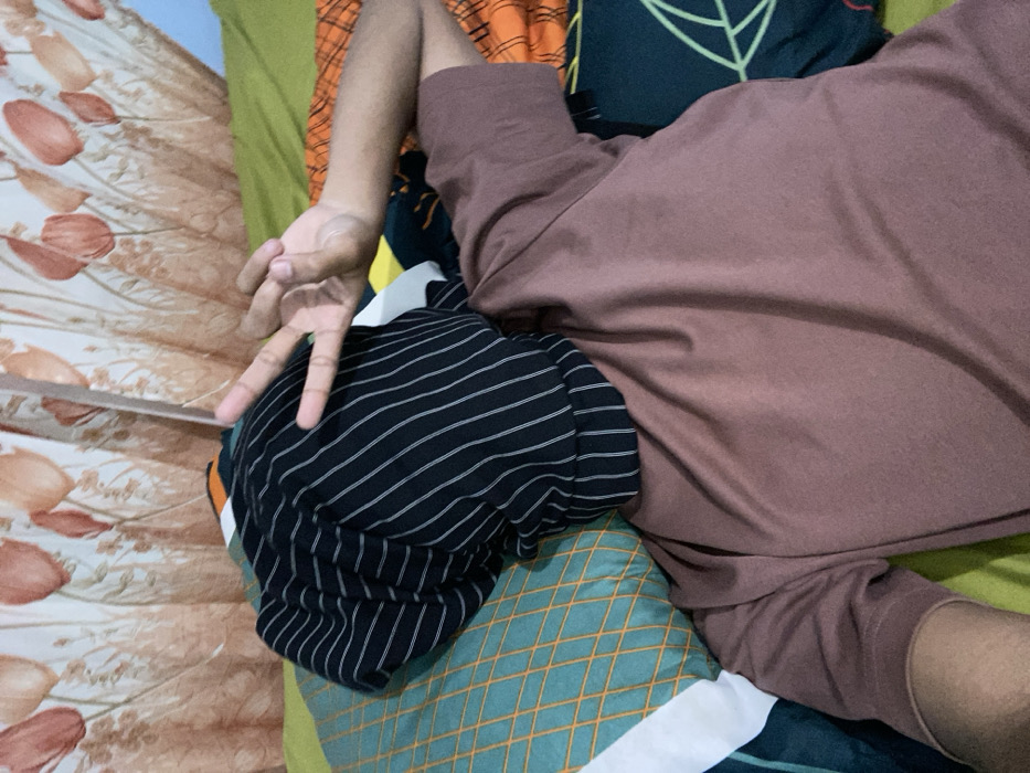 A person lies on a patterned bed. They wear a brown shirt. Their arm is visible, and their hand displays the peace sign. A black and white striped item rests on a patterned pillow near the arm. Additional pillows with geometric and leaf patterns are visible. The bedspread has an orange and brown floral design.