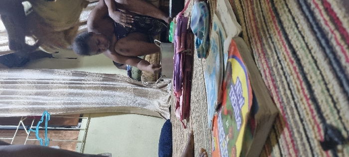 A person squats over a metal pot near a sink. A tan blanket with a geometric pattern hangs in the background. Hanging from the wall, near the pot, is a purple item next to some plastic bags and a book. A multi-colored rug is to the right. A blue towel and a clothing hanger are in the bottom left corner.