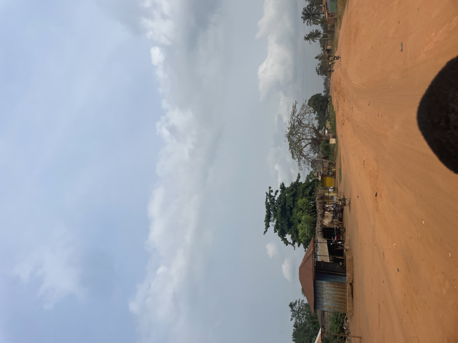 The image depicts an unpaved, reddish-brown dirt road stretching into the distance under a partly cloudy sky in Ikoga, Nigeria