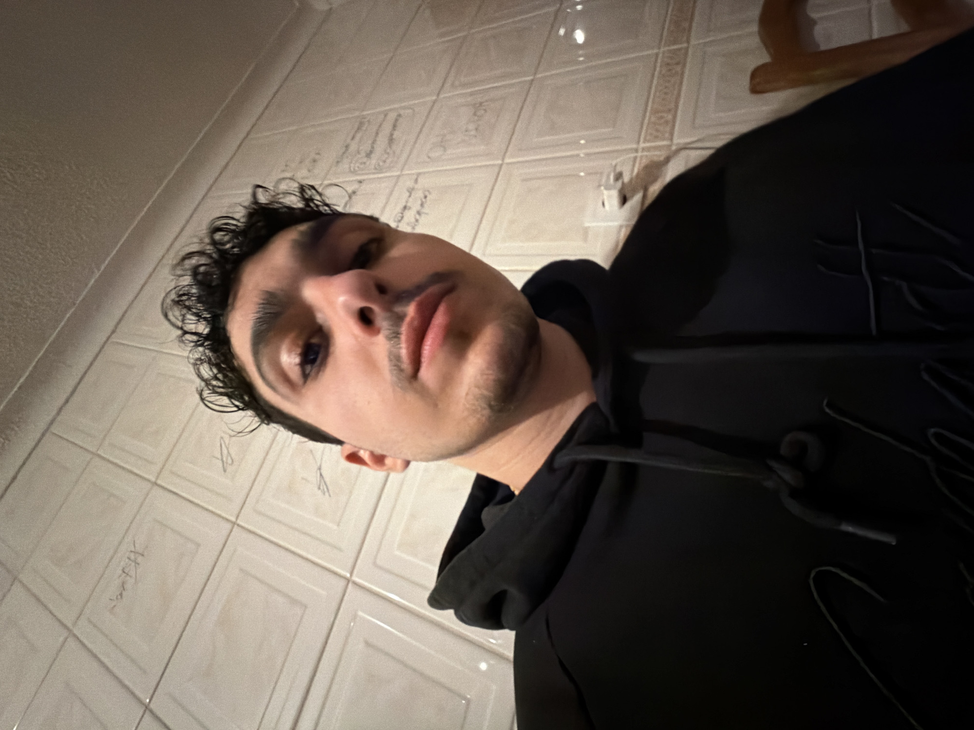 A low-angle, indoor portrait depicts a young adult male, likely in his 20s to early 30s, looking directly into the camera