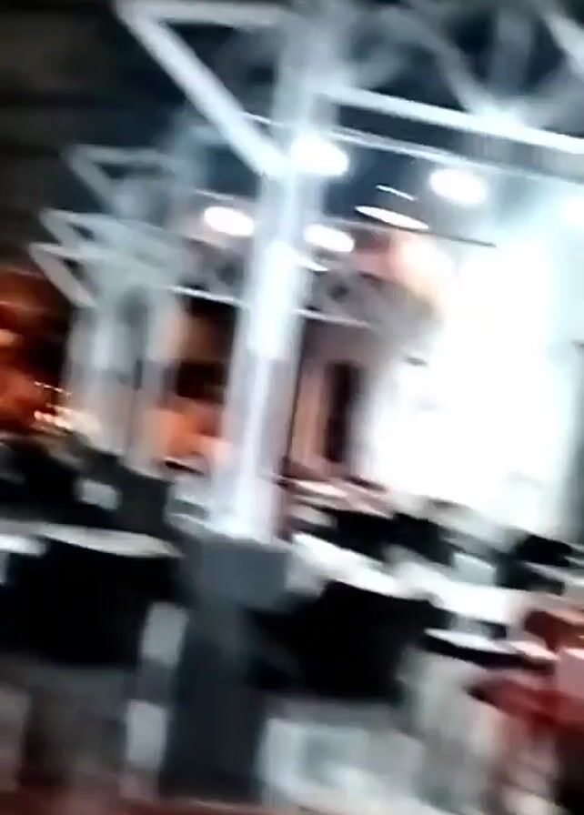 light-colored cat climbing a palm tree inside an outdoor eating area. The eating area has tables and chairs, and the light-colored walls are adorned with light fixtures. The background is dark, but there is a building visible. The video focuses on the cat as it climbs the tree trunk.