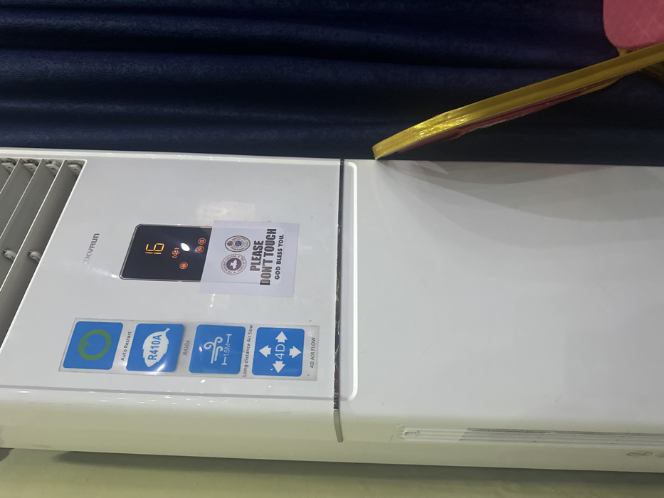 An interior scene in Sabon Tasha, Nigeria, depicts a white, tower-style SKYRUN air conditioner unit positioned against a light green wall on the left and a dark blue, pleated curtain on the right. The air conditioner displays "16" on its digital screen, with several indicator lights beneath. On its left side are blue informational stickers detailing features such as "Auto Restart," "R410A," "Long distance Air flow - 15M," and "4D AIR FLOW." Adhered to the front of the air conditioner, below the digital display, is a white sign with two circular logos at the top, bearing the text "PLEASE DON'T TOUCH" and "GOD BLESS YOU." A chair with a yellow-gold frame and a reddish-pink upholstered seat is partially visible in the bottom right, leaning against the air conditioner and the curtain. No individuals are present in the frame.