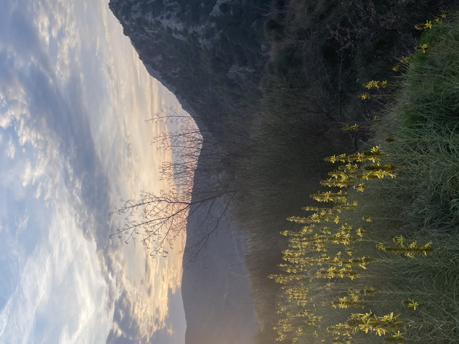 This image depicts a mountainous landscape in Košljun, Montenegro, during either sunrise or sunset. The foreground features a dense cluster of tall, yellow-flowering plants, possibly Asphodel, with prominent spires of blooms extending upward from slender green stalks. Behind these flowers, the midground consists of scrub brush and several bare-branched deciduous trees, silhouetted against the sky. In the background, a series of dark hills and mountains are visible; the left side shows distant, undulating terrain, while the right side reveals a more rugged, rocky mountain face partially covered with dark vegetation. The sky above is partially cloudy, transitioning from a light blue at the zenith to hues of orange and pink near the horizon, where a distinct warm light source is present on the far left. No individuals or animals are visible, and no discernible actions or interactions are occurring.