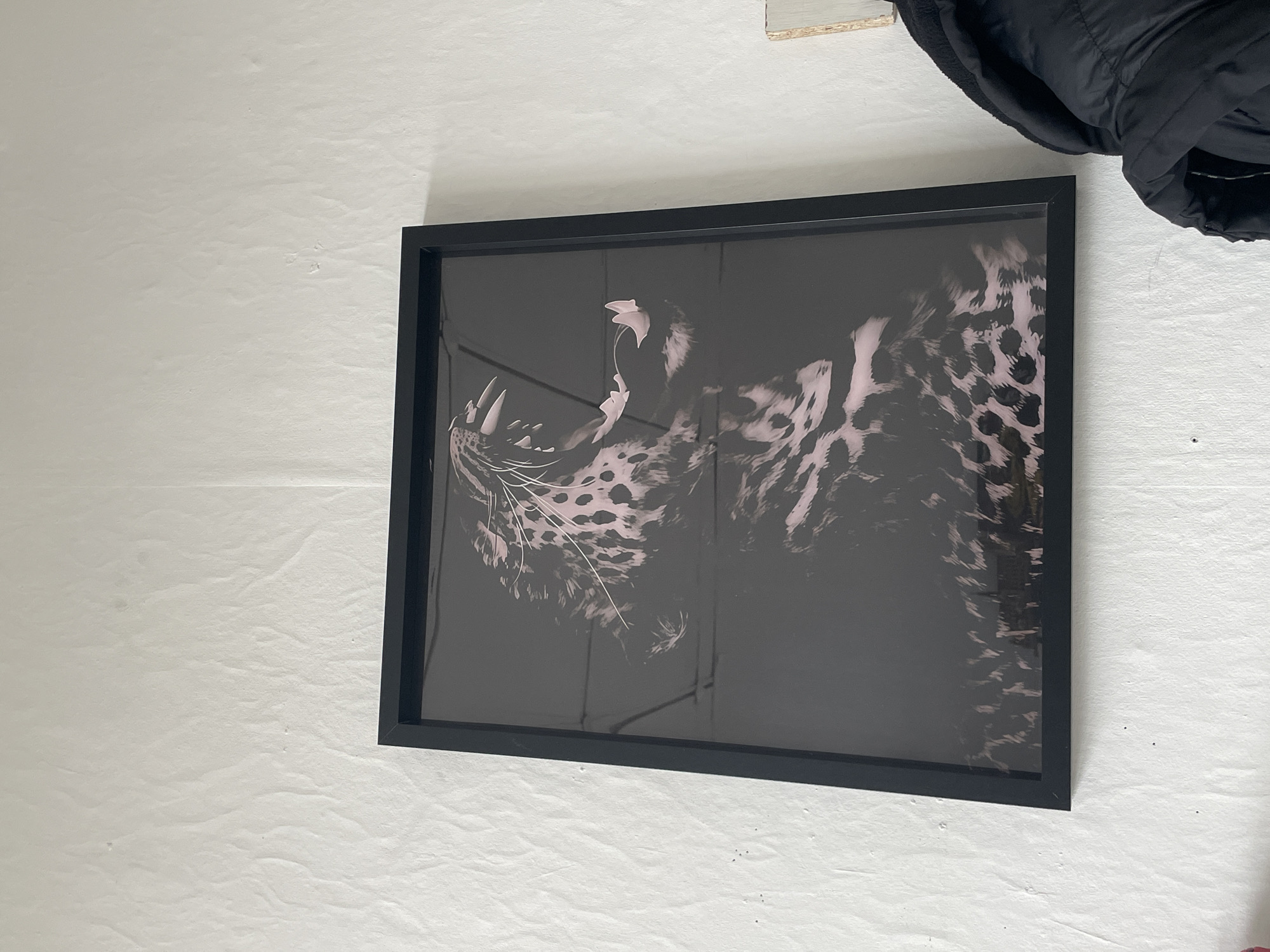 A framed print depicting a leopard hangs on a white wall. The print is encased in a black frame. Part of a black jacket is visible in the upper right corner. The location is not evident.