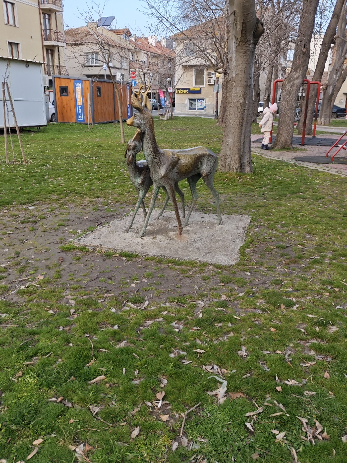 The image captures an outdoor public green space or park in Pomorie, Bulgaria. In the mid-ground, a bronze-patinated statue depicts two deer: a larger adult male with antlers standing upright, and a smaller fawn positioned closely behind it, appearing to nuzzle the adult's side. Both statues rest on a rectangular concrete base set into the ground. The ground cover consists of patchy green grass, areas of exposed soil, and scattered dry leaves and small twigs. Several large deciduous trees with bare branches are prominent, particularly to the right of the statue, delineating a dirt path. In the background, to the left, a white temporary structure is visible, followed by two wooden kiosks, one displaying "Спорт Тото" in blue lettering. Behind these structures, a multi-story residential building with balconies and a tiled roof is present. To the right, further urban buildings are seen, one featuring an "inbet" sign in blue and yellow, and an external air conditioning unit. A children's playground is partially visible to the far right, identified by red metal structures (likely a swing or climbing frame) and a dark, padded ground surface. A single child, dressed in a light-colored long coat and dark shoes, stands with their back to the viewer, positioned near one of the tree trunks adjacent to the playground. The sky is overcast and light blue.