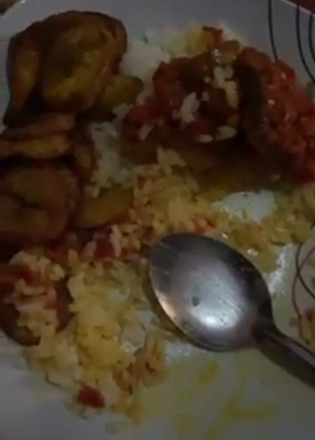 A close-up shot shows a partially eaten plate of food. The plate contains white rice, fried plantains, and what appears to be meat covered in a red sauce. A metal spoon rests on the plate. The scene suggests a meal has been consumed, leaving remnants of the food on the plate. The background is slightly blurred, indicating a shallow depth of field.