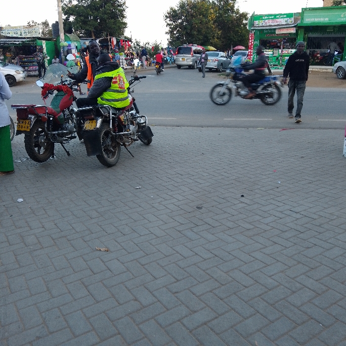 This image depicts a commercial street in Wote, Kenya, characterized by active pedestrian and vehicular traffic. In the foreground, a grey paver sidewalk with a herringbone pattern is visible. A person, partially visible on the far left, wears a green garment and light-colored footwear. Two red motorcycles are parked on the sidewalk. The first motorcycle, on the left, bears the registration plate "KRBA 304R." The second motorcycle, to its right, displays the plate "KRAQ 564S." A male individual, wearing a bright yellow high-visibility vest over a dark shirt, is seated on the second motorcycle. Another male individual, dressed in a dark jacket and a dark cap, stands beside the seated motorcyclist, engaged in an interaction. Separating the sidewalk from the background is a paved asphalt road marked with a white double solid line. A dark-colored motorcycle with a rider is captured in motion blur, traveling from left to right across the road. To the right of the moving motorcycle, a male pedestrian wearing a dark hoodie, grey jeans, and light-colored shoes walks towards the right side of the frame. The background features commercial buildings with green-painted facades, prominently displaying "Safaricom" and "M-PESA" signage. Numerous market stalls are set up, showcasing various goods including clothing and household items. Several vehicles, including cars and vans, are present on the road and parked along the street. Multiple individuals are visible in the background, walking or standing near the stalls. Lush green trees line the horizon above the buildings. Utility poles and overhead wiring are also present. The lighting suggests daylight conditions, possibly late afternoon or overcast.