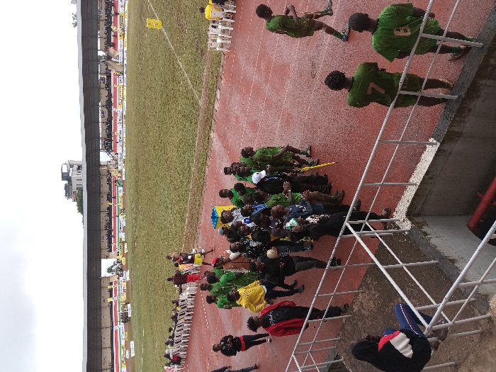 The image depicts an outdoor sports stadium scene under an overcast sky, with visible dampness on surfaces. The location is Kinoru Stadium in Meru, Kenya. In the immediate foreground, a person wearing a black, white, and red hooded jacket with blue trousers is seated on a white metal railing, facing the playing area. Below this railing, a concrete structure reveals a red pipe. Two individuals in green sports jerseys, bearing numbers '7' and '6' on their backs, stand at the edge of a red running track, observing the field. The midground features a group of approximately 15-20 individuals gathered on the wet red track. Most are young males, many wearing green shirts or jerseys, suggesting a team or associated group. Notable individuals include one in a yellow hoodie, one in a red jacket, and one holding a white and green patterned ball. Another person carries a yellow stick or umbrella. A single individual in a green uniform walks away from the main group towards the field. Further along the track, a line of white plastic chairs is arranged near a blue container and a yellow marker. The background encompasses a grass sports field, exhibiting some wear and muddy patches, with white demarcation lines visible. Covered stadium grandstands, partially filled with spectators, extend along the far side of the field. Advertising banners are visible below the stands. A multi-story building is discernible above the stadium roofline in the distance.