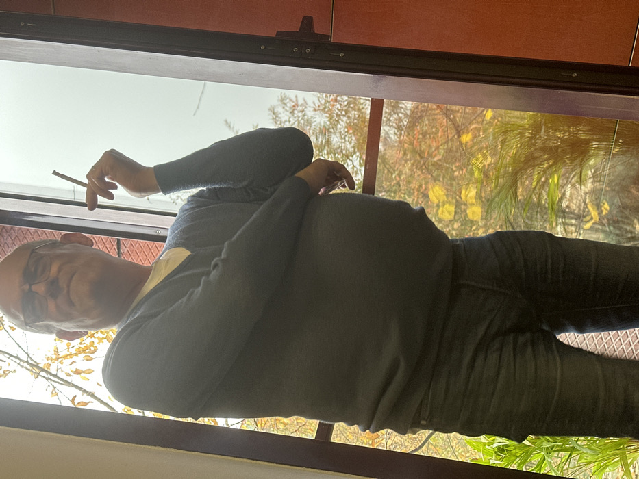 A male individual stands in an interior space, partially framed by a dark brown door or window frame, looking directly at the viewer in Aubervilliers, France. He is bald, wears dark-rimmed glasses, and has a neutral to slightly smirking expression. He is dressed in a dark blue V-neck sweater over a light-colored shirt and dark jeans. His right arm is bent, and he holds a lit, slender cylindrical object, consistent with a hand-rolled cigarette or joint, between his right index and middle fingers. His left arm is bent across his torso. The background, viewed through a glass pane, reveals an outdoor autumn scene with trees displaying yellow and orange foliage under an overcast sky. A tall, leafy green potted plant is visible outside in the lower right portion of the background. A reddish-brown wall or panel is visible to the right of the interior door/window frame.