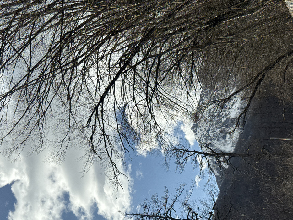 The image displays a mountainous landscape in Krasnaya Polyana, Russia, under a bright, partly cloudy sky. The upper section of the frame features a clear blue sky interspersed with large, white cumulus clouds. Bare deciduous trees with dark, intricate branches are prominent, extending from the right side across the upper portion of the image and also appearing in the left foreground. In the mid-ground, a snow-capped mountain peak is visible, exhibiting significant snow coverage on its upper slopes. The lower parts of the mountainside and surrounding terrain appear dark, consistent with bare forestation or shaded areas. No people, animals, or distinct man-made structures are evident, apart from a faint, dark vertical line in the lower center that may indicate a utility pole or cable. The overall scene suggests a late winter or early spring environment.