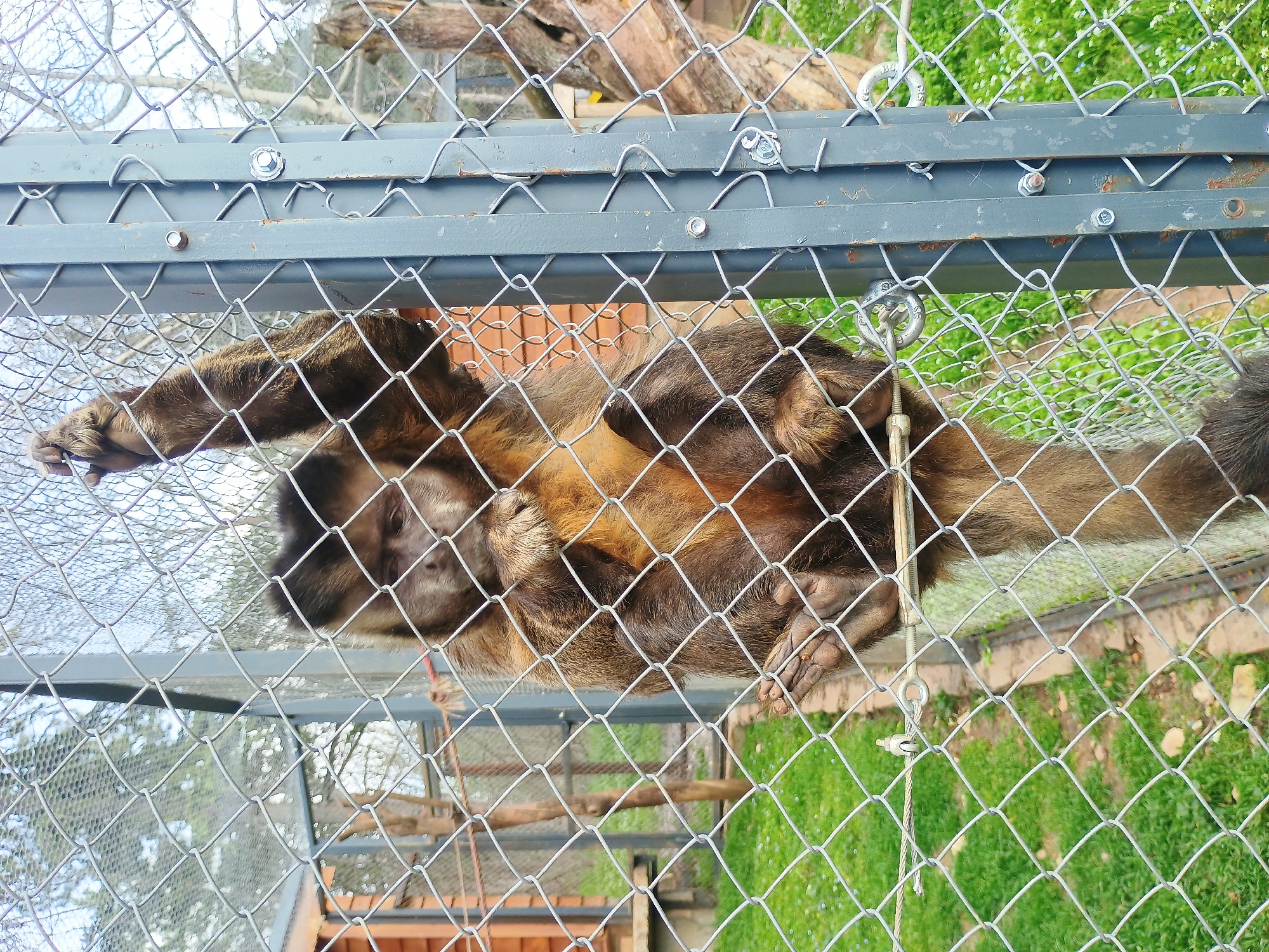 A brown capuchin monkey is lying on its back inside a wire cage. The cage has a gray metal frame. Outside the cage, green grass and some wooden structures are visible. The location is possibly a zoo or animal sanctuary in Stara Zagora, Bulgaria.
