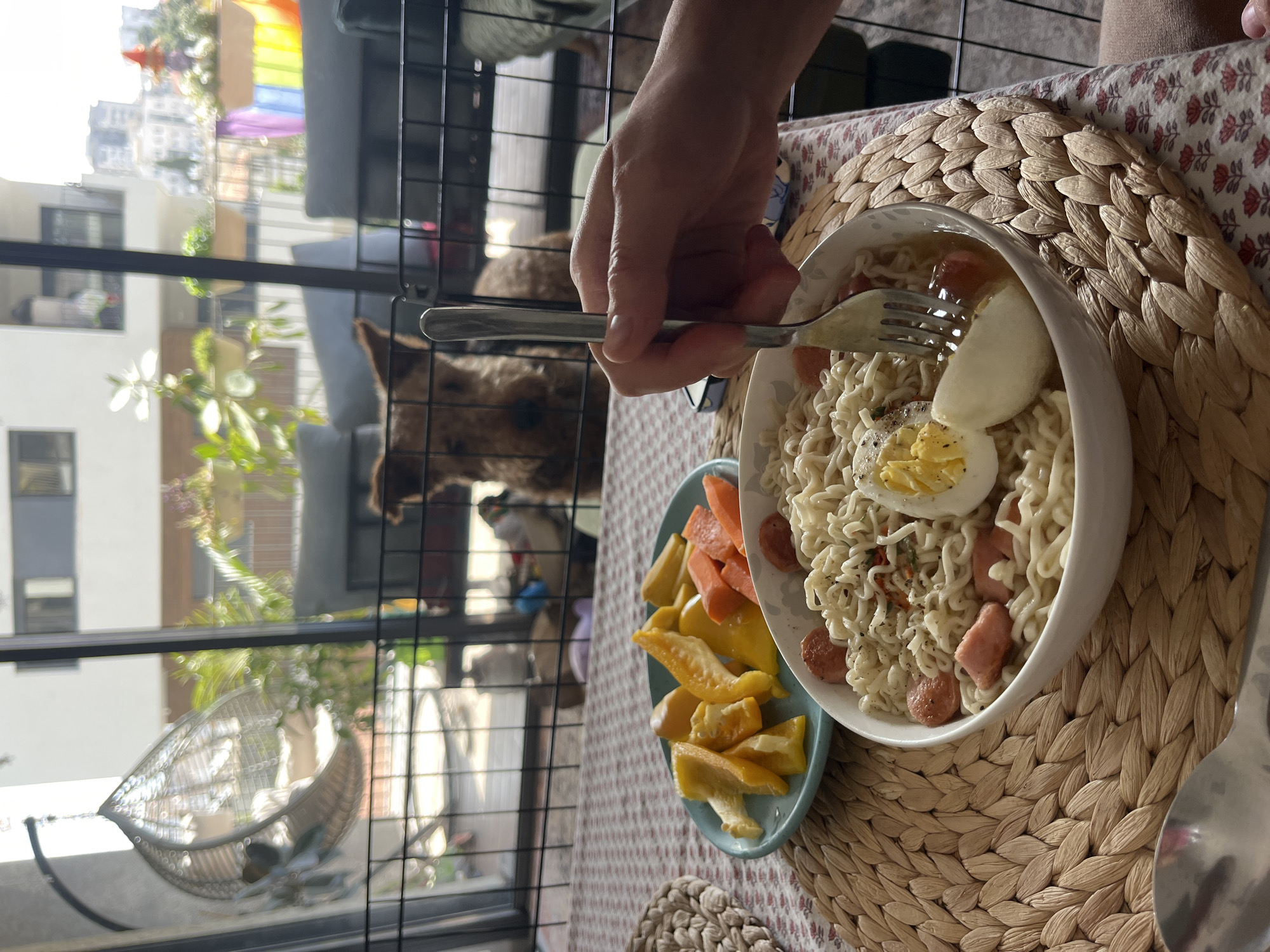 A person is eating noodles with sausage and egg from a white bowl, using a fork in Ramat Gan, Israel. Beside the bowl is a plate with yellow and orange peppers. The bowl and plate are on a woven placemat. A dog is visible behind a metal wire partition near the window. Outside the window is a building with a rainbow flag and a hanging chair.