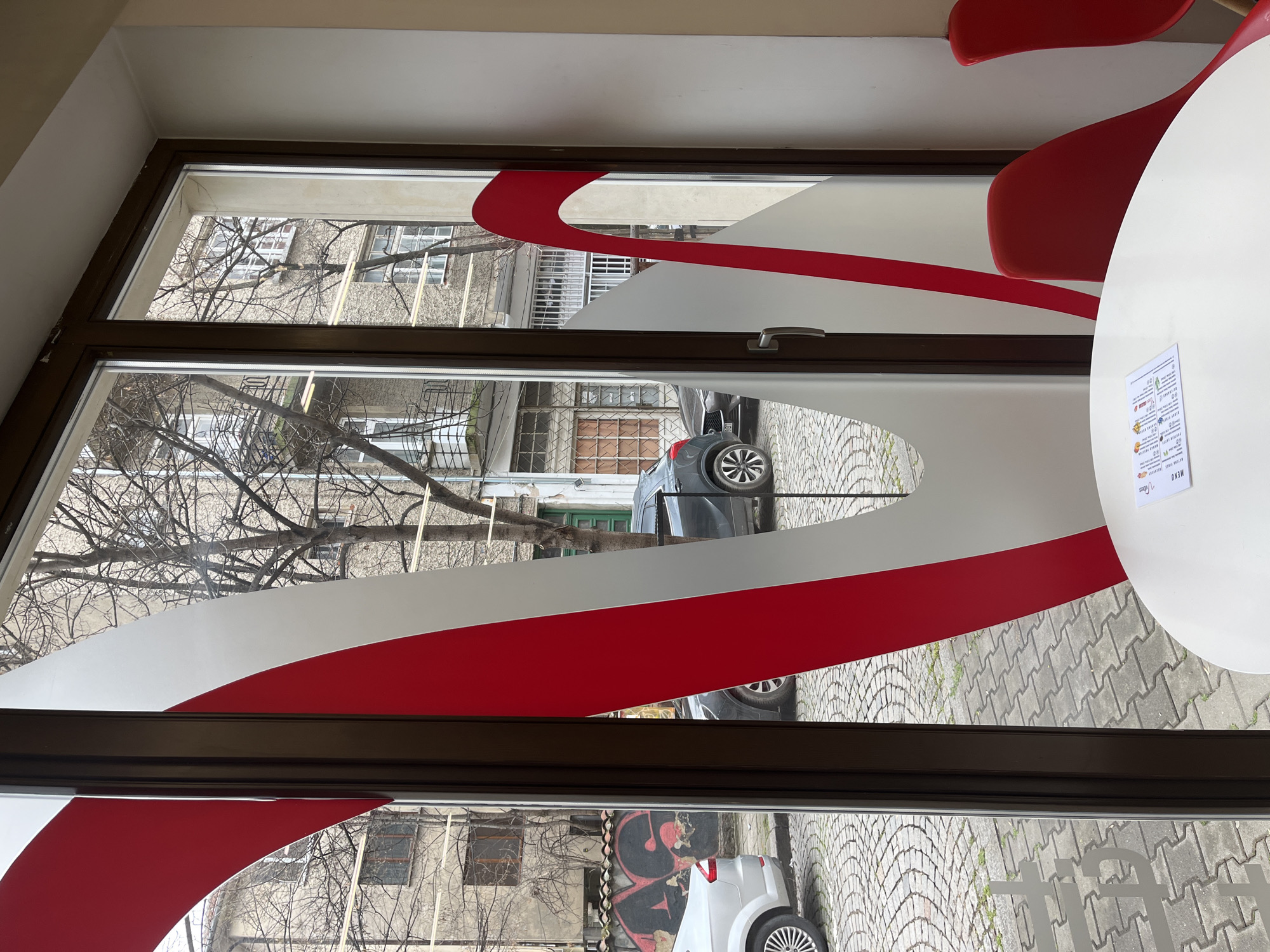 The image presents an interior perspective looking out through a large window from a commercial establishment located in Sofia, Bulgaria. In the lower right foreground, a white circular table is visible, upon which a white rectangular menu with text and small illustrations rests. To the right of the table, two red, modern-design chairs are partially depicted. The window consists of multiple dark brown framed panes, obscured in part by red and frosted white curvilinear decals applied to the glass. Beyond the window, an outdoor street or alley is visible, paved with a combination of cobblestones and rectangular pavers. Scattered between these pavers, sparse green vegetation is present. On the left side of the street, a silver Ford Mondeo sedan is parked with its rear oriented towards the viewer. Behind this vehicle, a weathered building wall features prominent red and black graffiti depicting stylized letters. Further along the street on the right, a dark grey SUV is parked. The background consists of several multi-story residential buildings with aged, light-colored facades and numerous windows, some of which feature external grates. Numerous deciduous trees with bare branches are visible throughout the exterior scene, indicative of a dormant season. The sky appears overcast. No individuals are present or engaged in activities within the captured scene.