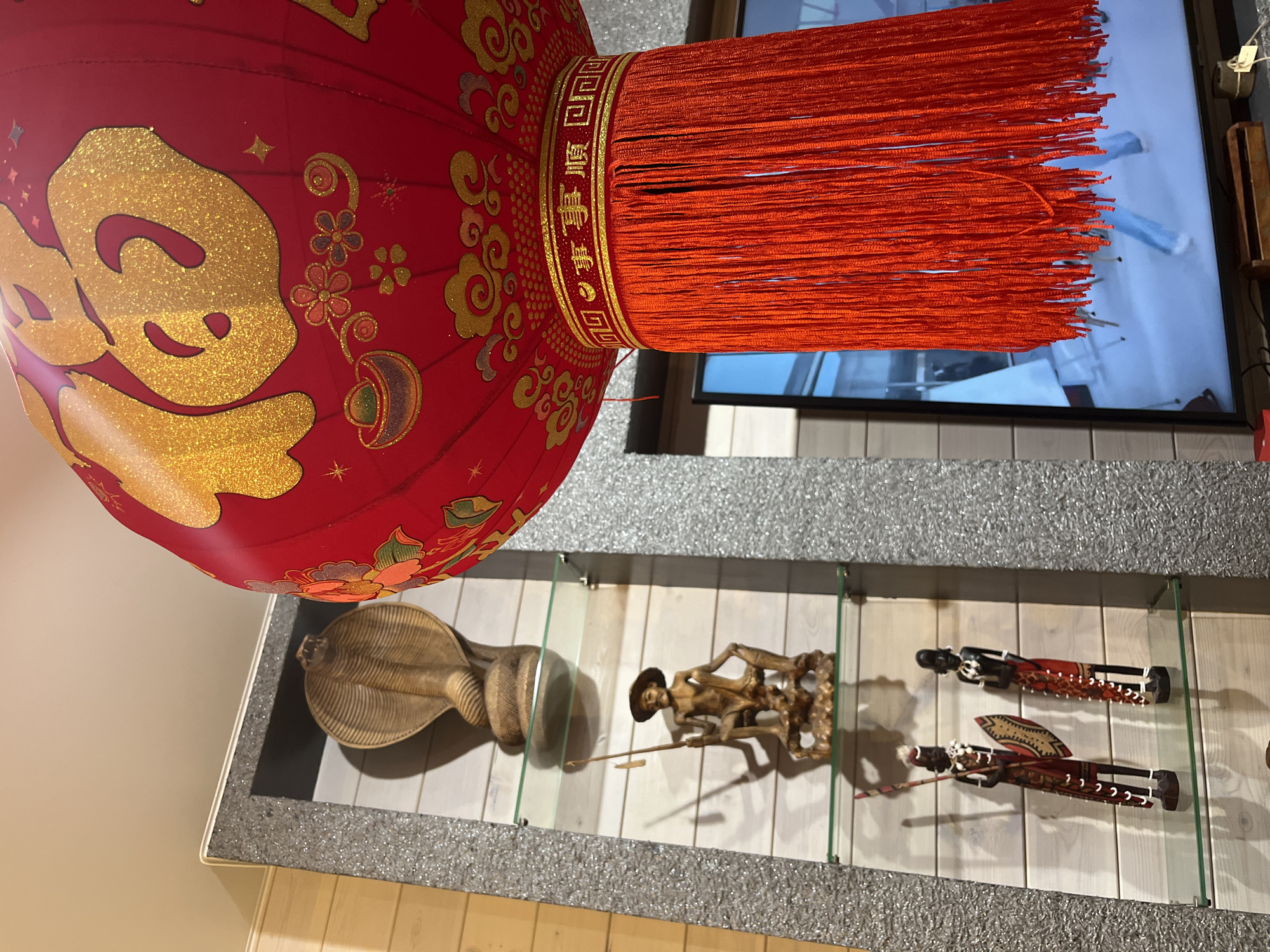 A red Chinese lantern with gold designs and a red tassel hangs above a display case