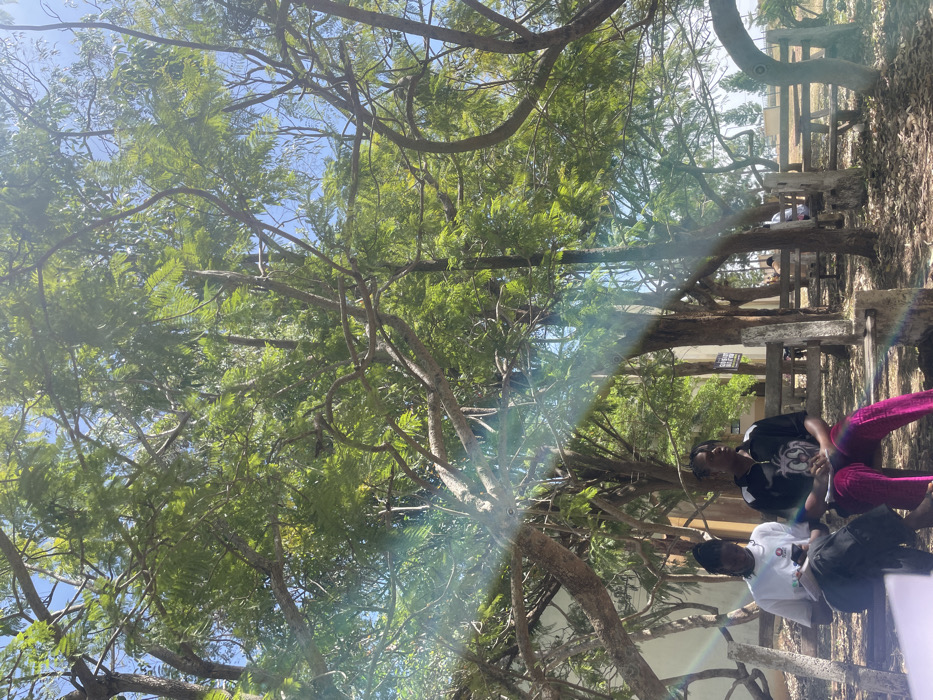 The image portrays an outdoor scene in Durimi, Nigeria, characterized by bright daylight filtered through a dense tree canopy