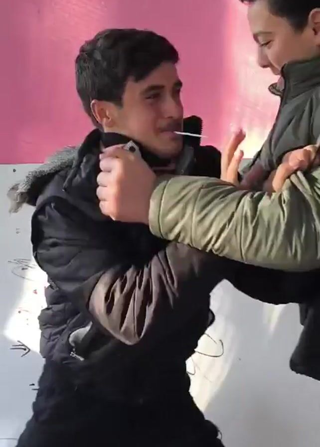 Two young men playfully wrestle outside, one holding what appears to be a lollipop in his mouth