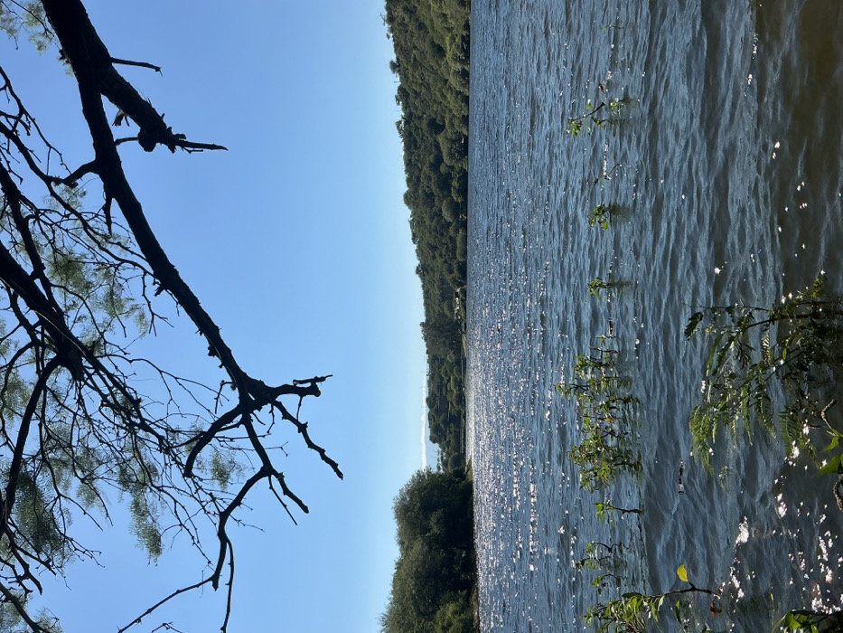 The image depicts a natural outdoor scene at Dique El Jumeal, San Fernando del Valle de Catamarca, Argentina. The upper portion of the frame is dominated by a clear, bright blue sky. Extending into the top left and center from an unseen anchor point are dark, silhouetted branches of a tree, displaying fine foliage. Below this, a substantial body of dark blue water occupies the midground, its surface marked by numerous shimmering specular reflections from direct sunlight, indicating ripples. Submerged and partially submerged green aquatic plants are visible in the lower left portion of the water. The background features undulating hills densely covered with various green trees and vegetation, forming a lush, unbroken natural landscape along the water's edge and extending into the distance. No individuals or overt human activity are present in the scene.