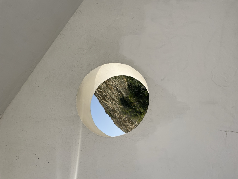 The image displays a circular opening in a light-colored, textured wall or architectural structure, observed in Varvarovka, Russia. The foreground features an off-white, roughly stuccoed wall exhibiting minor surface variations and a diagonal beam of sunlight on its upper left section. The circular aperture, brightly illuminated along its inner rim, frames a clear daylight view of a natural landscape. Through the opening, a layered, light-brown rock formation or cliff face is prominent, partially obscured at its base by dense green vegetation, including bushes and small trees. A segment of clear, light-blue sky is visible above the rock formation in the upper left portion of the circular frame. No individuals, animals, or specific actions are present in the scene.