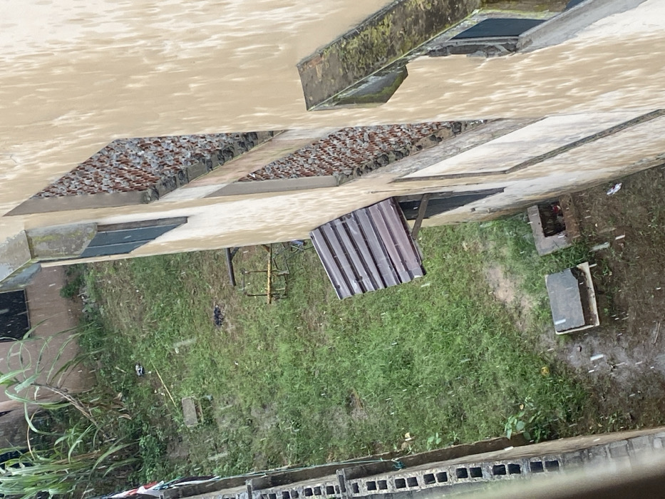 The image depicts an exterior view from an elevated position overlooking a grassy, wet area adjacent to a multi-story building during rainfall in Egan, Nigeria