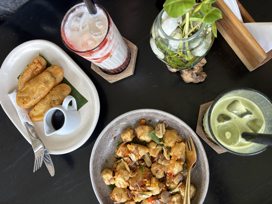 An overhead shot captures a dark table spread with several dishes. Fried bananas rest on an elongated white plate, accompanied by a small white sauce container. A tall glass of a pink-tinged drink sits nearby. A bowl of fried tofu mixed with vegetables lies next to the bananas. A tall glass filled with a green drink and ice also sits on the table. A small glass vase with pebbles and a plant, along with a wooden holder for napkins, completes the tableau.