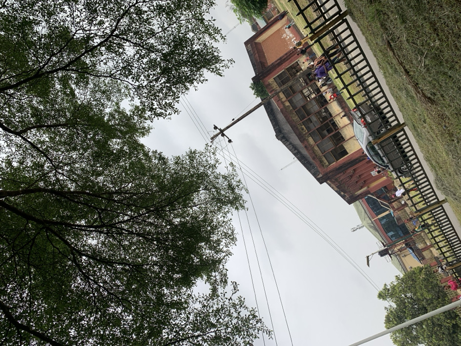 This image depicts a busy outdoor scene, likely on the campus of the University of Calabar (UNICAL) in Calabar, Cross River State, Nigeria, consistent with the architecture of older faculty buildings such as the Faculty of Law or Arts. The sky is overcast and grey, providing diffuse lighting. In the foreground, a strip of sparse grass and dirt is visible, separated from the midground by a black metal fence with vertical picket-like elements. The midground features a paved area or pathway where numerous individuals are present. Most are walking or standing, dressed in casual attire, suggesting students or campus visitors. A dark-colored sedan is parked or slowly moving behind the fence, near the buildings. The background is dominated by two primary buildings. On the right, a large, multi-story structure is constructed primarily of reddish-brown brick with a dark, flat or low-pitched roof. It features numerous rectangular window openings, many appearing to be louvred. The building exhibits signs of age and weathering, with some visible markings or graffiti on its far right wall. To the left of this structure, a more modern, multi-story building is partially visible, characterized by a lighter-colored, possibly green-hued roof and some glass facades. A large water tank on a stand is visible on its roof. A tall wooden utility pole with multiple power lines runs diagonally from the mid-right towards the upper-center. Another pole, possibly a streetlight, stands on the far left. The upper portion of the image is densely covered by the dark green canopy of a large tree, with its branches and leaves silhouetted against the sky. Smaller trees and vegetation are also visible at ground level near the buildings.